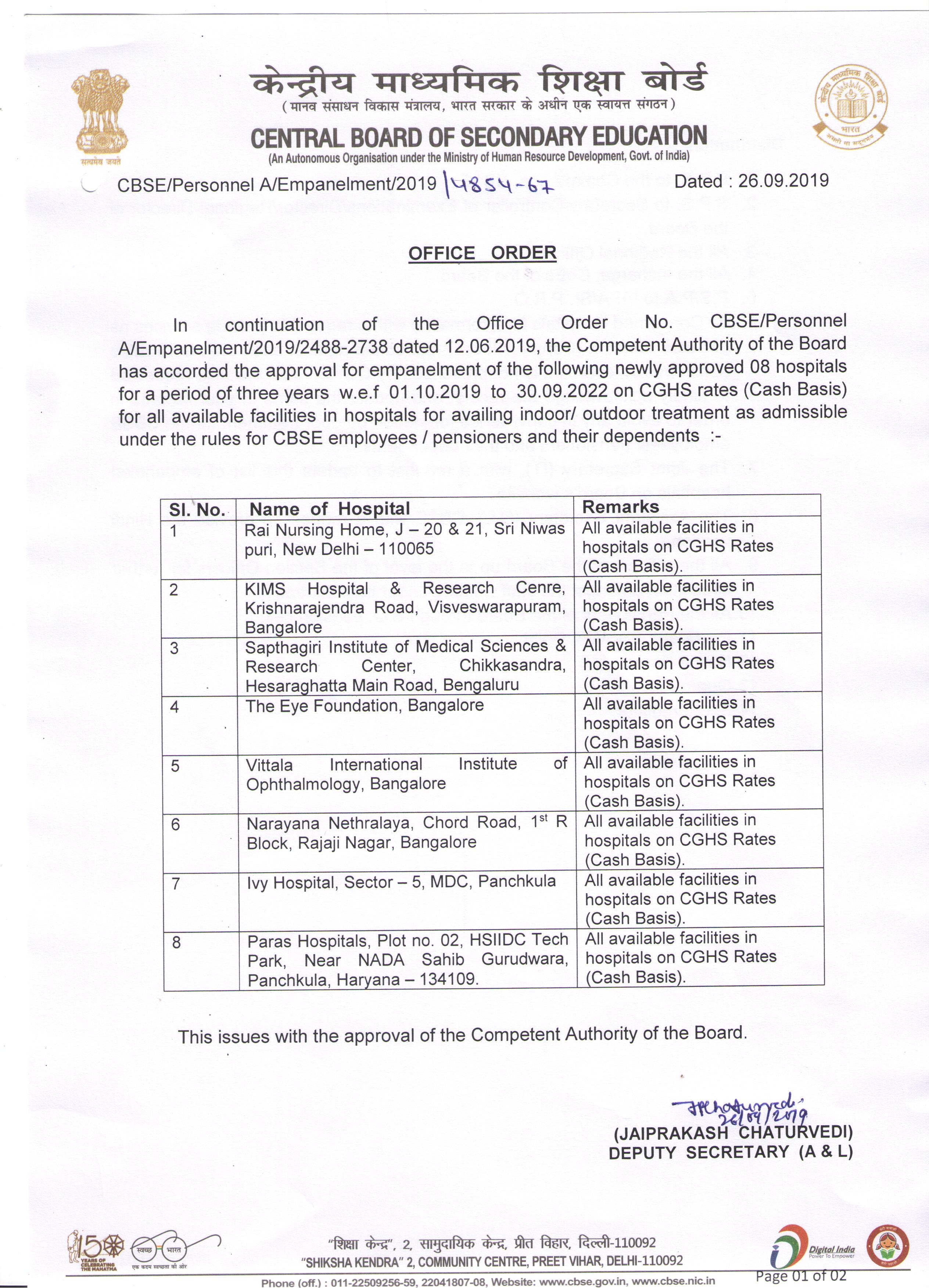 CBSE approved Hospitals for Treatment for Regular & Retired Employees of the Board