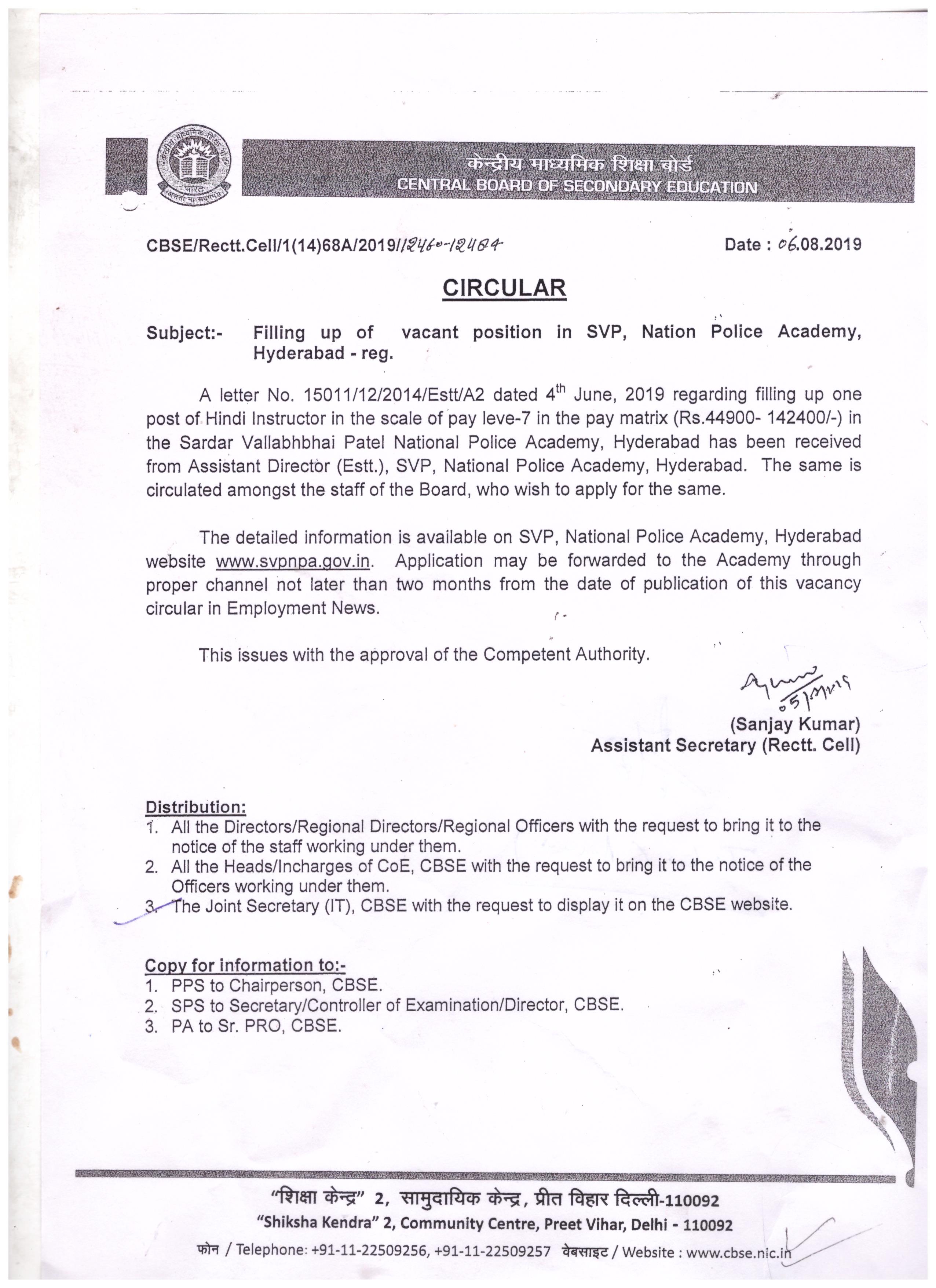 CIRCULAR - FILLING UP OF VACANT POSITION IN SVP, NATION POLICE ACADEMY, HYDERABAD