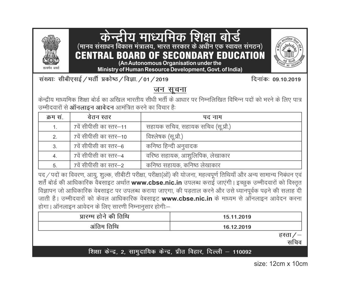 CBSE Recruitment Online Application Submission Last Date Extended to 23rd December 2019 |