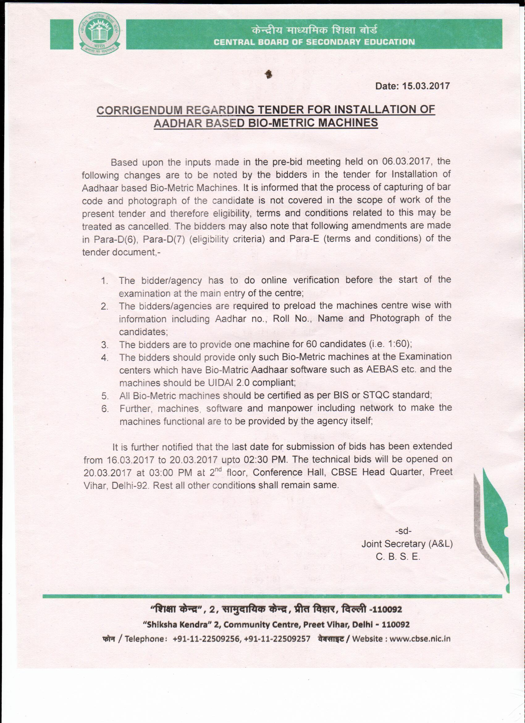 Tender Document For Installing Aadhar Based Biometric Machines At Locations Across India