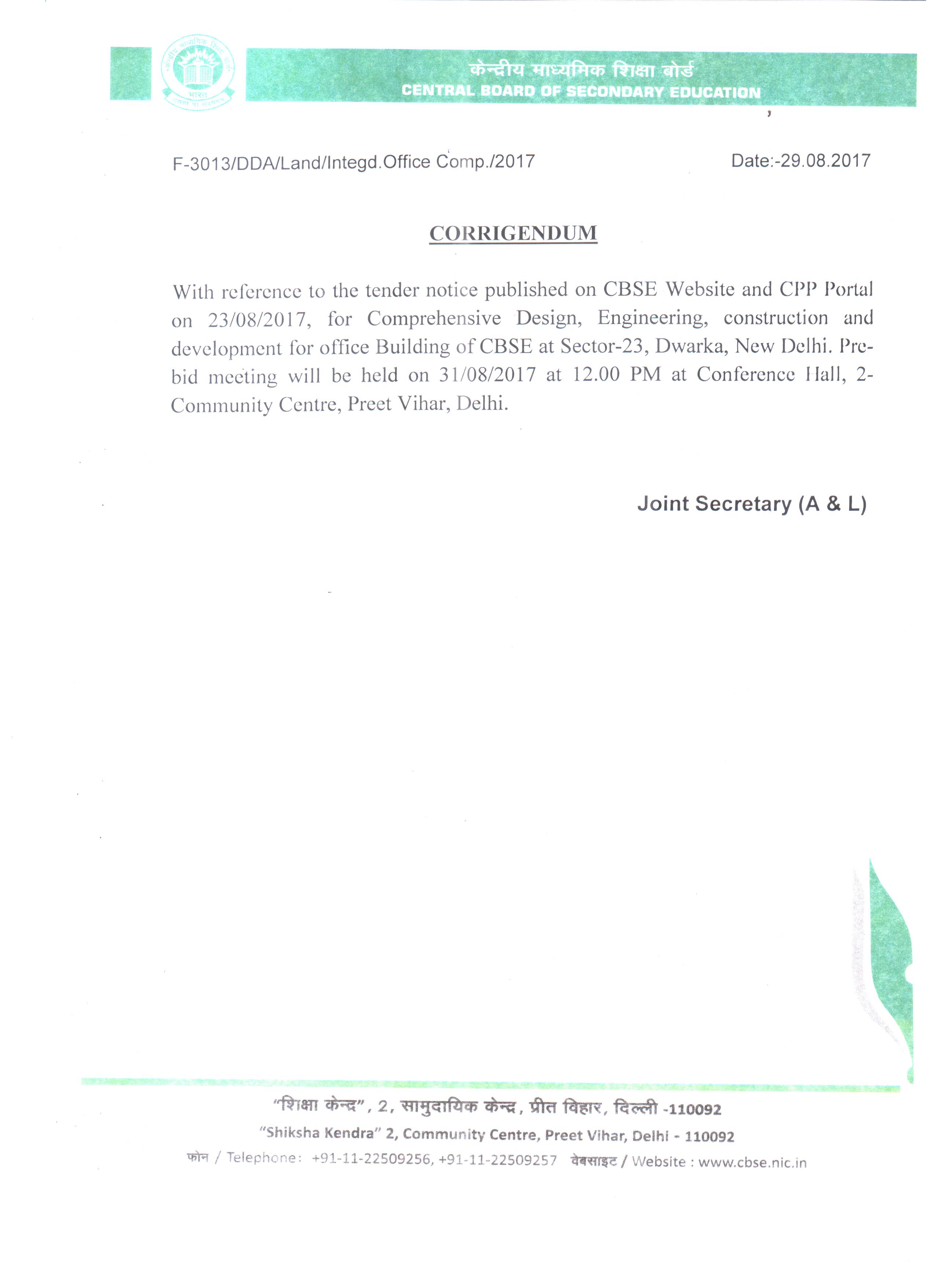 Tender For selection of Project Management Consultant (PMC) for Comprehensive Design Engineering, Construction & development for Office Building of CBSE at Sector-23,Dwarka, New Delhi